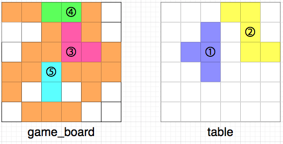 위 그림에서 왼쪽은 현재 게임 보드의 상태를, 오른쪽은 테이블 위에 놓인 퍼즐 조각들을 나타냅니다. 테이블 위에 놓인 퍼즐 조각들 또한 마찬가지로 [상,하,좌,우]로 인접해 붙어있는 경우는 없으며, 흰 칸은 퍼즐이 놓이지 않은 빈 공간을 나타냅니다. 모든 퍼즐 조각은 격자 칸에 딱 맞게 놓여있으며, 격자 칸을 벗어나거나, 걸쳐 있는 등 잘못 놓인 경우는 없습니다.